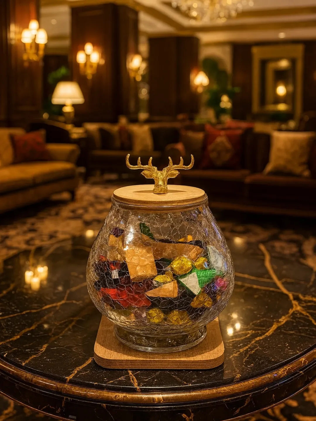 شکلاتخوری بلور آبگز سایز بزرگ با درب چوبی طرح گوزن